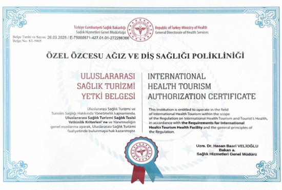 Tesisimiz, Uluslararası Sağlık Turizmi ve Turistin Sağlığı Hakkında Yönetmelik kapsamında, Uluslararası Sağlık Turizmi Sağlık Tesisi Yetkinlik Kriterleri’ne ve Yönetmeliğin genel esaslarına uyarak, Uluslararası Sağlık Turizmi faaliyetinde bulunmaya hak kazanmıştır.